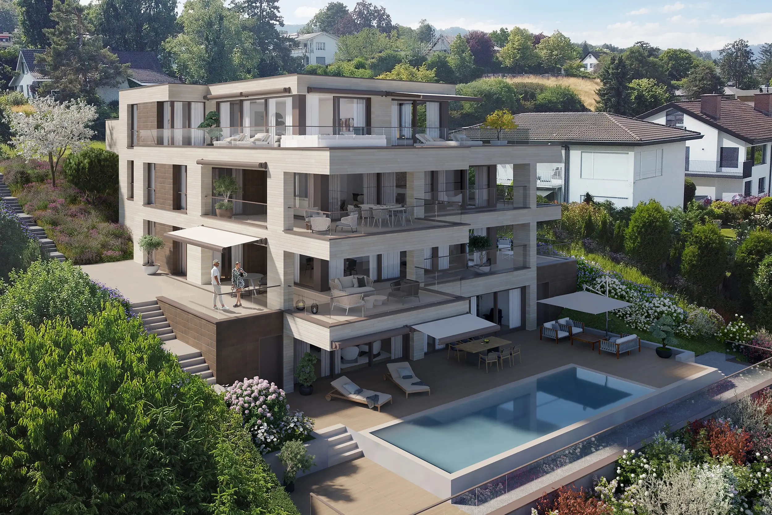 In seiner äusseren Erscheinung überzeugt das Dreiparteienhaus im Villenstil mit einer zurückhaltenden Formensprache und stilvollen, hochwertigen Materialien mit sorgfältig ausgewählten Details, die dem Haus eine diskrete, zeitlose Noblesse verleihen.